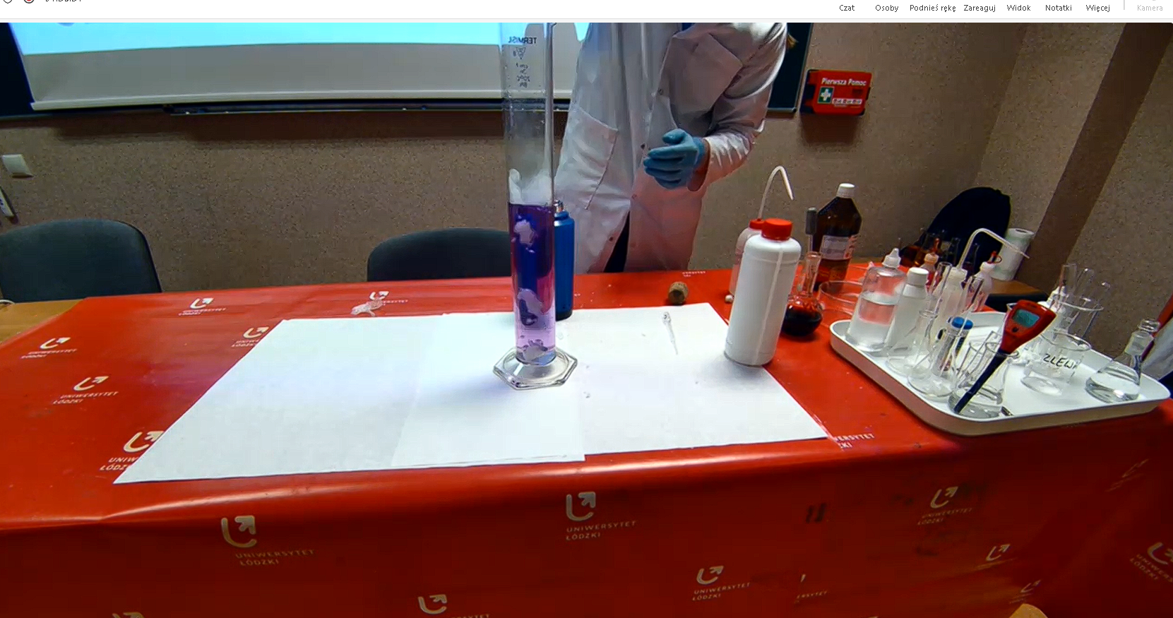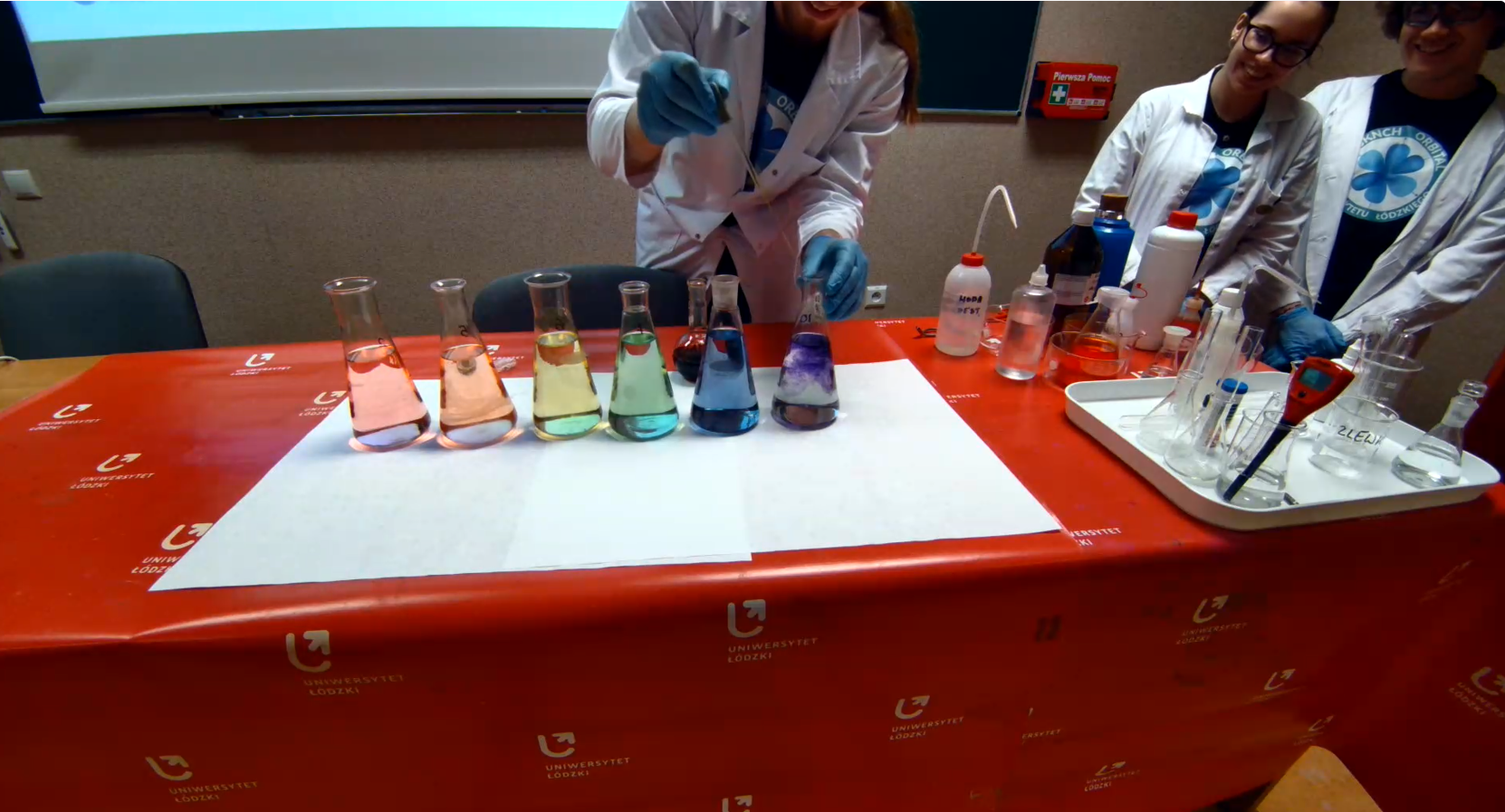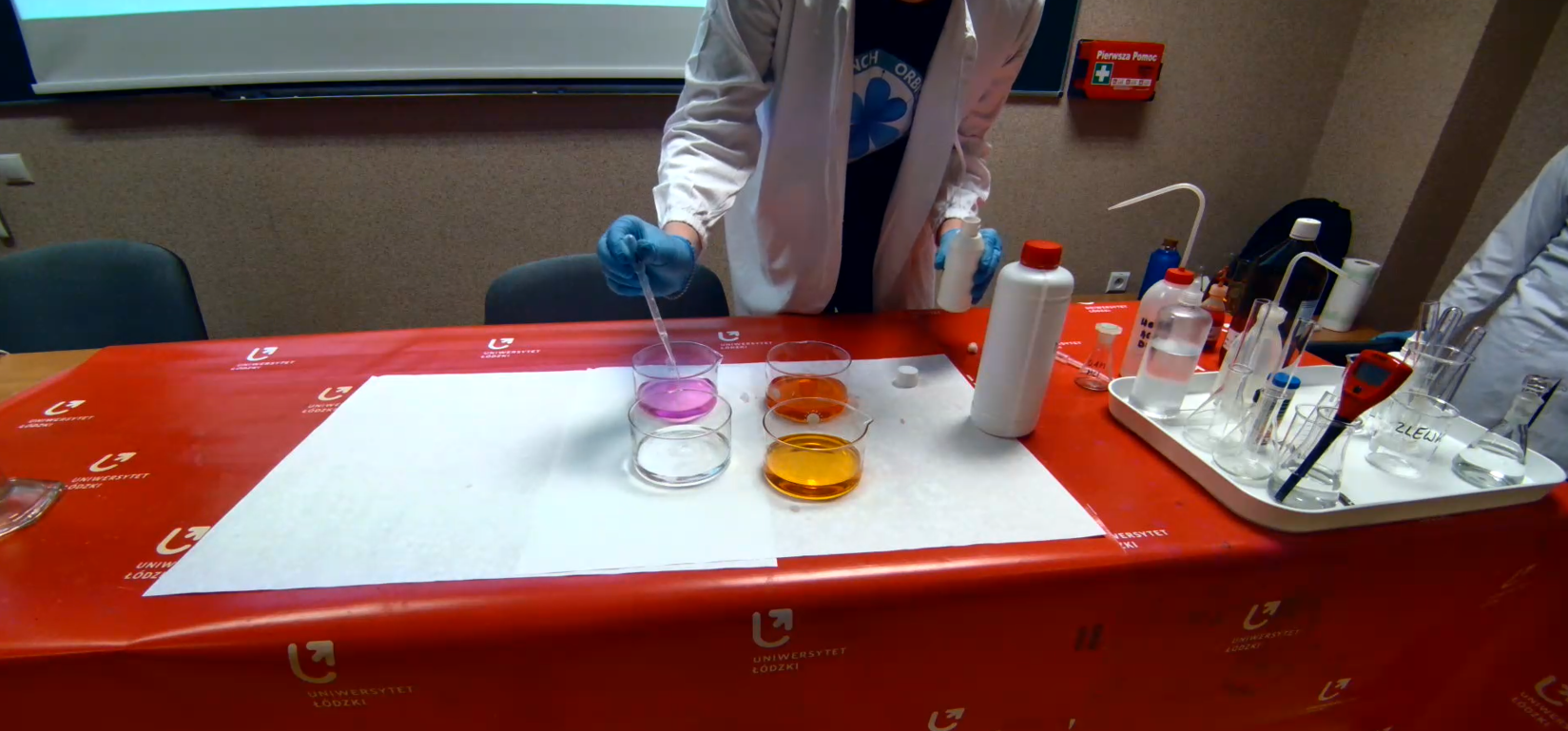 Po części teoretycznej odbyły się pokazy doświadczeń, które przygotowali i wykonali studenci Koła Naukowego Chemików „ Orbital” . Mogliśmy obejrzeć 5 eksperymentów pokazujących zmiany barwy różnych wskaźników chemicznych w roztworach o różnym pH.