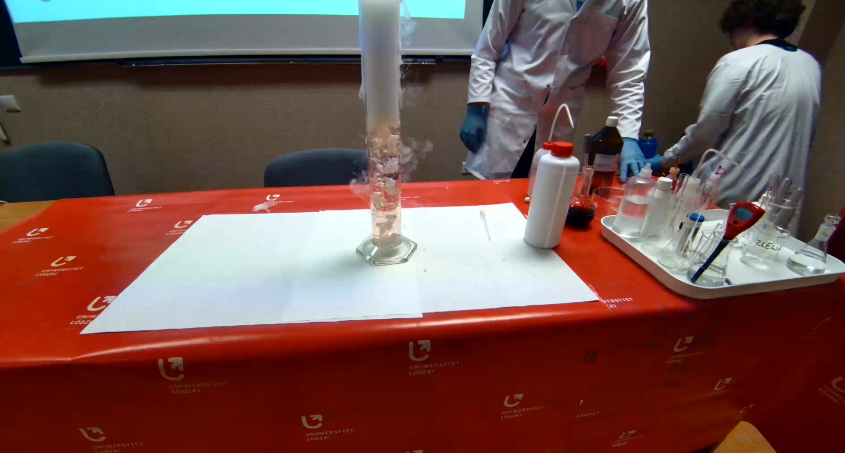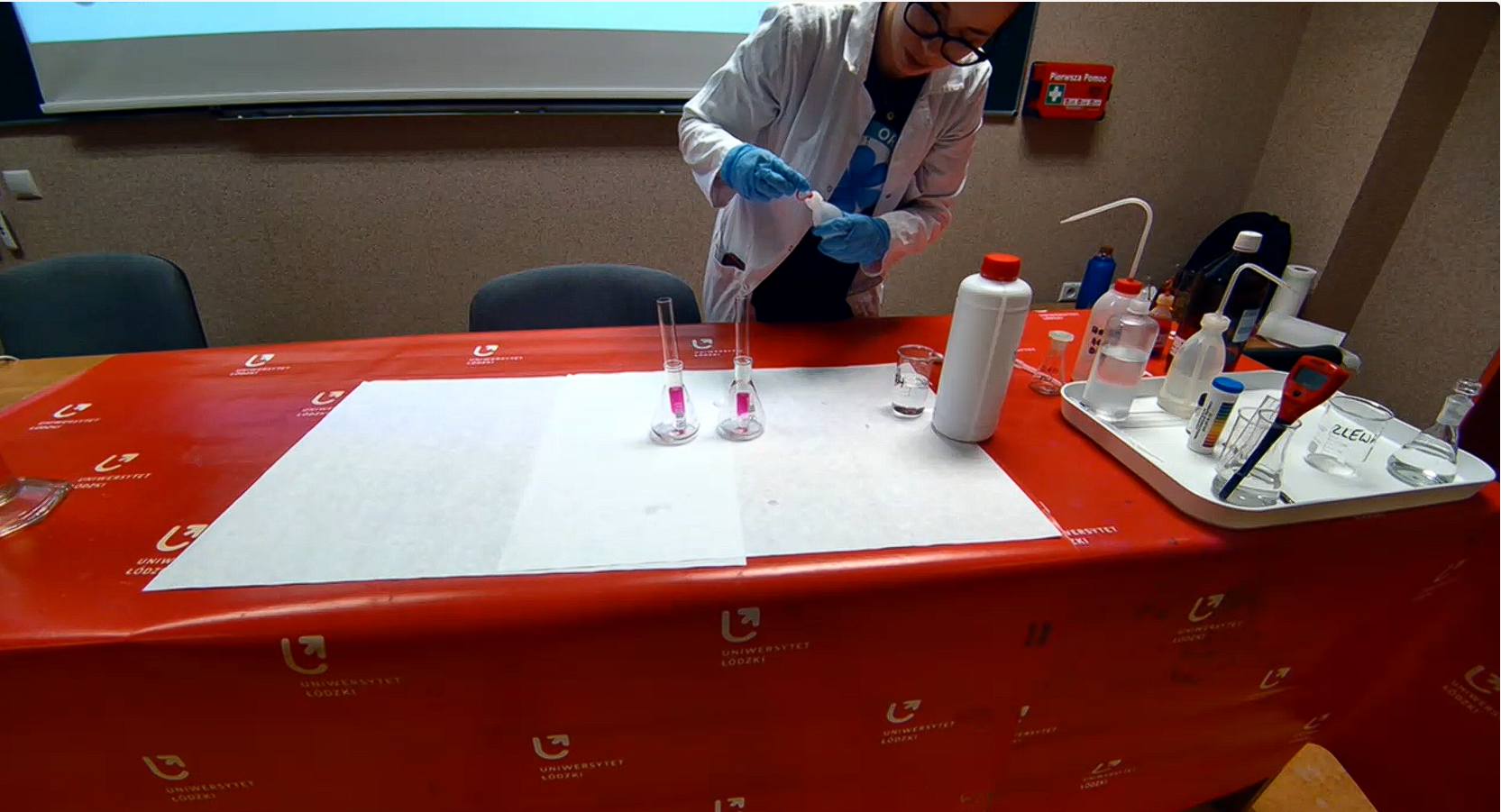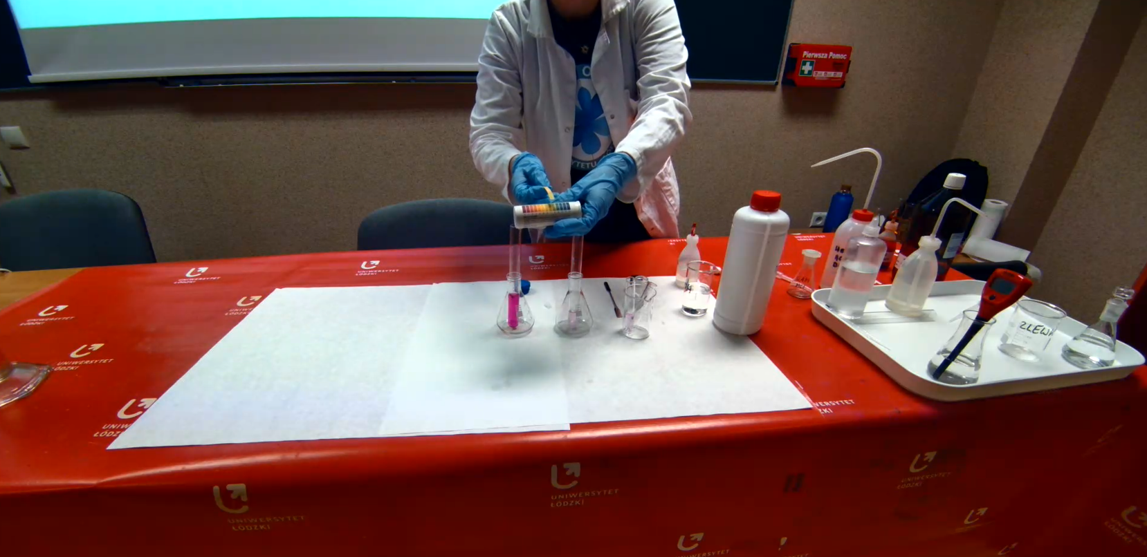 Po części teoretycznej odbyły się pokazy doświadczeń, które przygotowali i wykonali studenci Koła Naukowego Chemików „ Orbital” . Mogliśmy obejrzeć 5 eksperymentów pokazujących zmiany barwy różnych wskaźników chemicznych w roztworach o różnym pH.