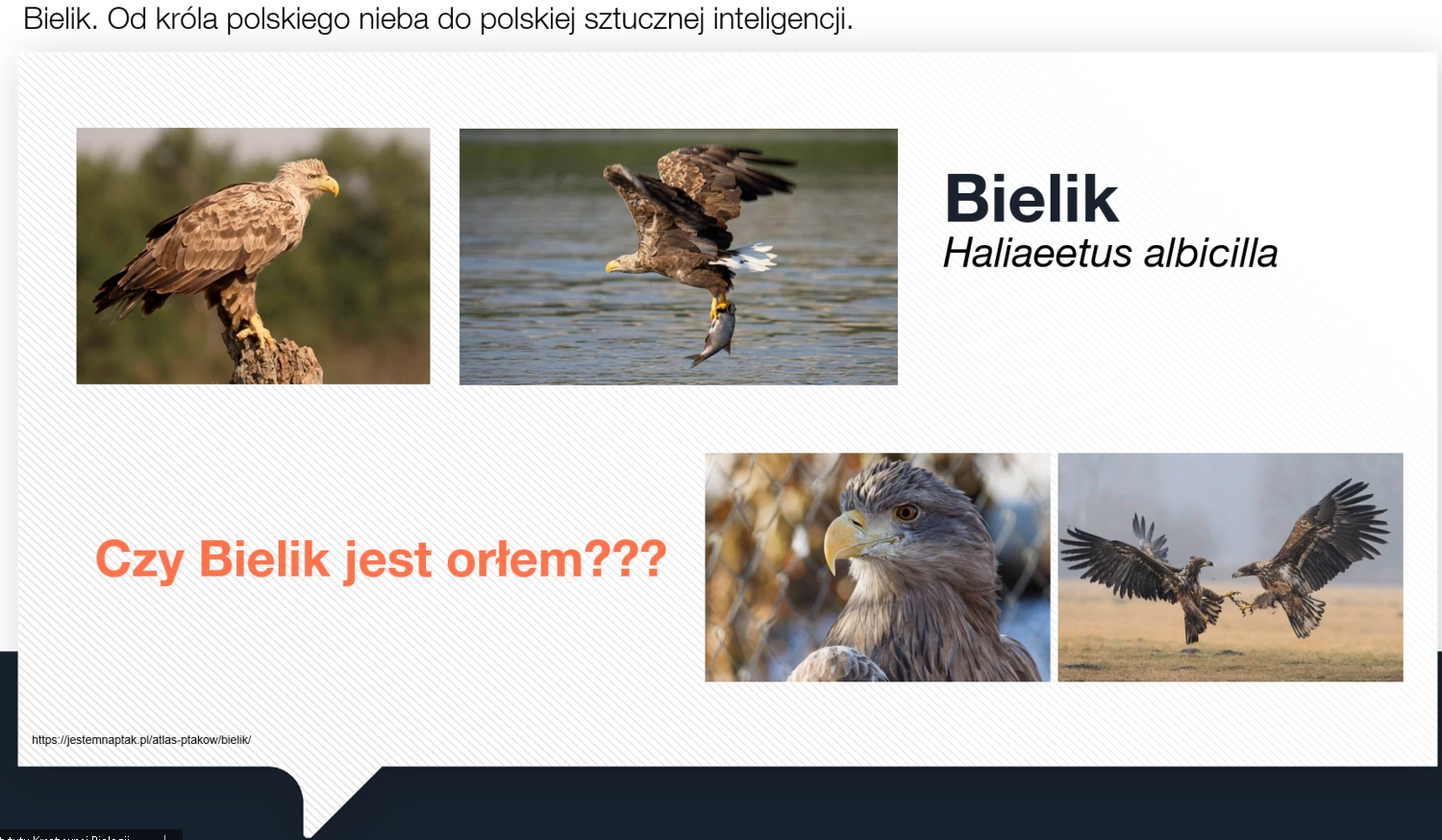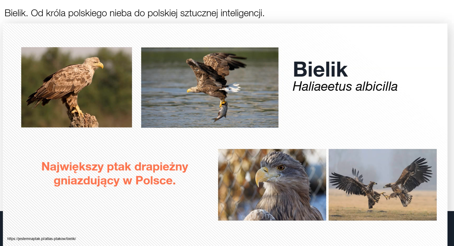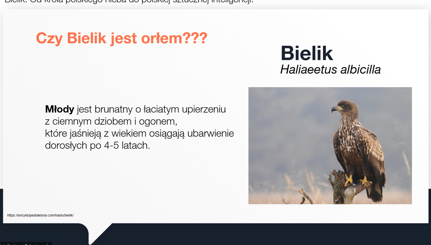 Wykład poprowadziła dr hab. Anna Ciesielska, prof. UŁ z Katedry Mikrobiologii Molekularnej. Bielik (Haliaeetus albicilla), majestatyczny ptak szponiasty i symbol polskiej przyrody, od wieków budzi podziw swoją siłą i niezależnością. Podczas spotkania uczniowie poznali biologię i ochronę bielika jako gatunku. Jest to jeden z największych ptaków drapieżnych w Europie, należący do rodziny jastrzębiowatych. Zamieszkuje głównie tereny nad jeziorami, rzekami i wybrzeżami morskimi. Charakterystyczną cechą dorosłych osobników jest biała głowa i ogon oraz masywny, żółty dziób. Bielik żywi się głównie rybami, ale poluje też na ptaki wodne i padlinę. Jest gatunkiem chronionym i w Polsce uznawany jest za symbol siły oraz wolności.