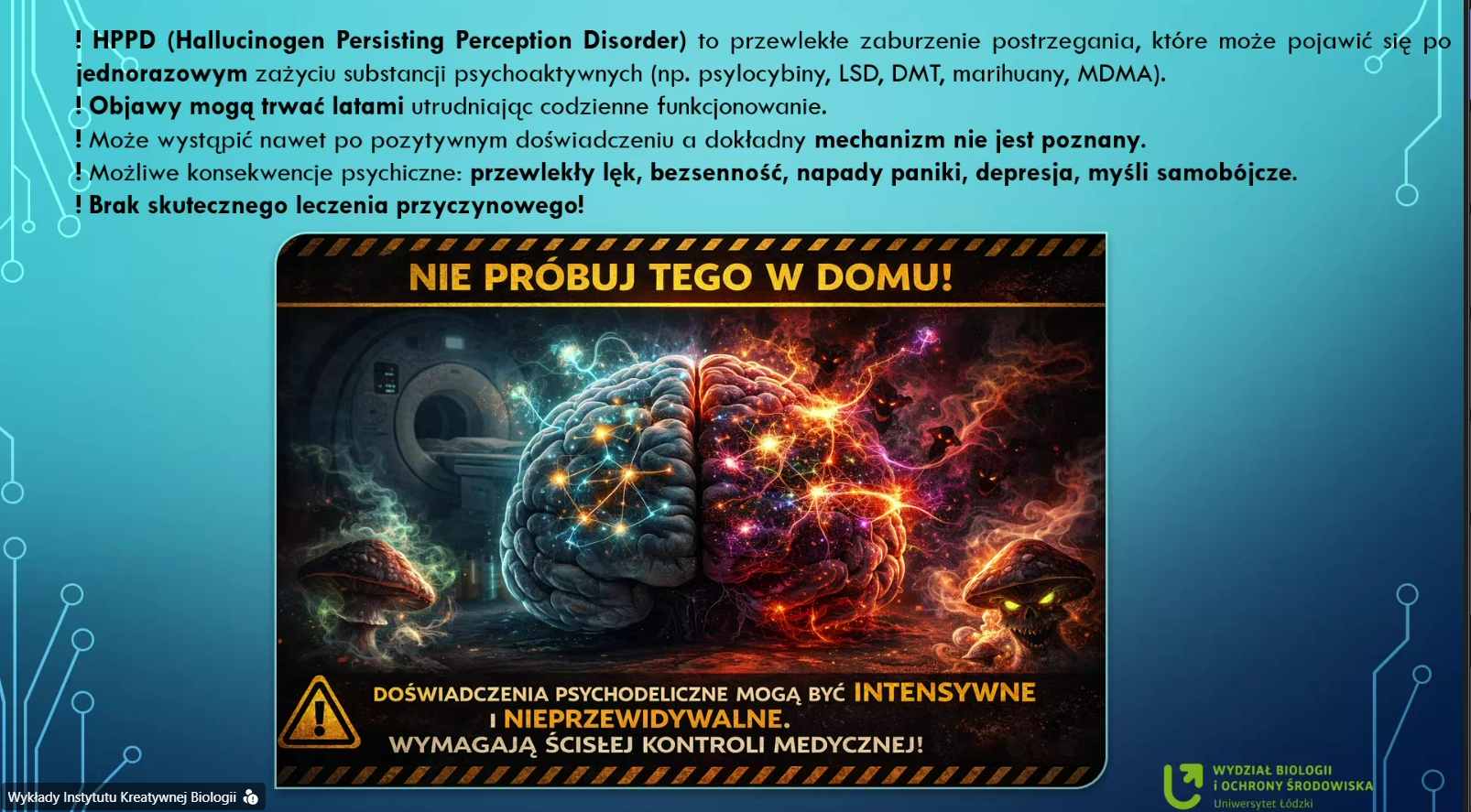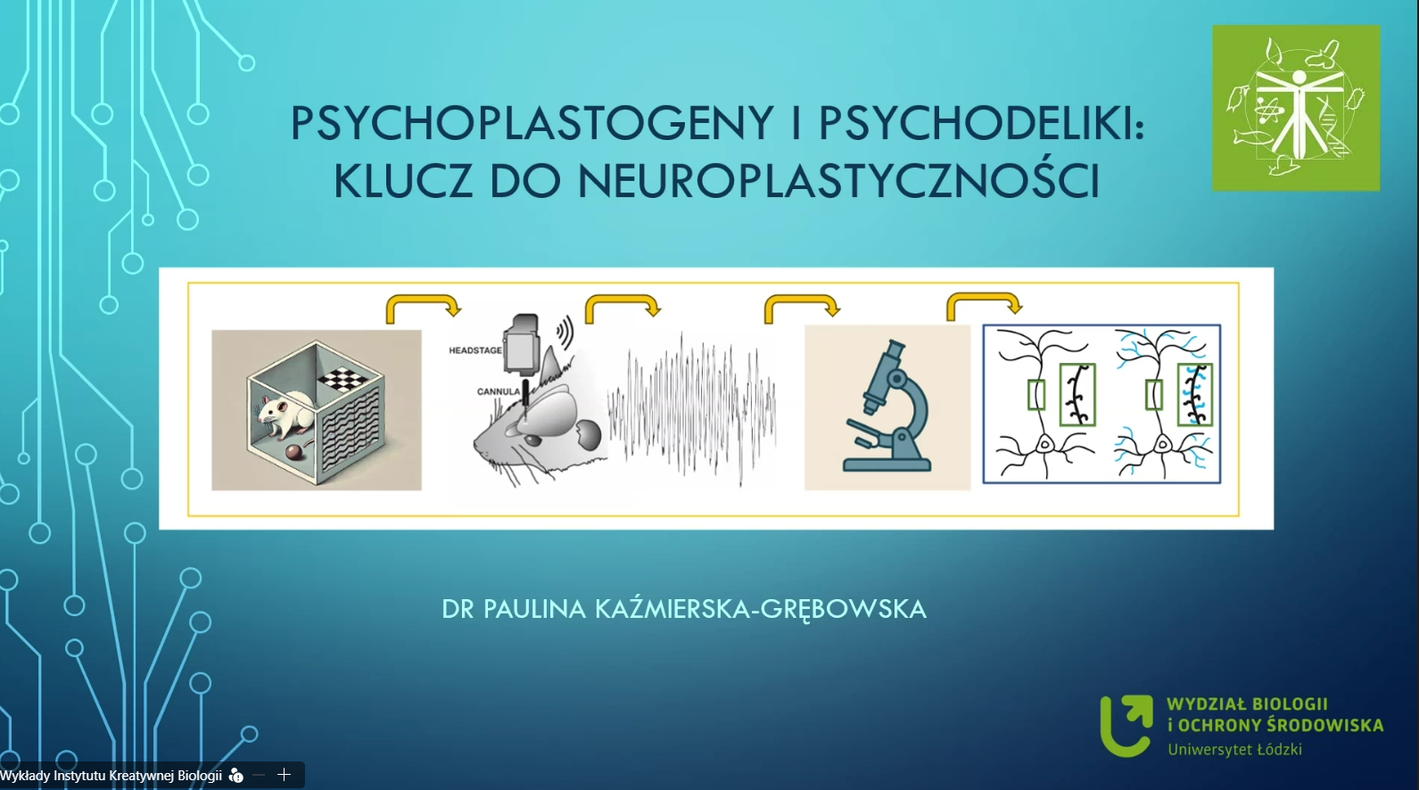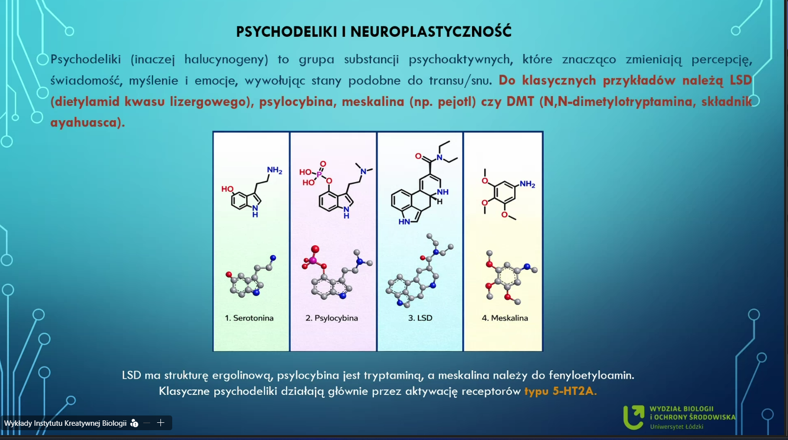 i zachowaniem. W drugiej części wykładu prelegentka wytłumaczyła w jaki sposób, substancje takie jak ketamina, psylocybina czy pochodne ibogainy wpływają na funkcjonowanie mózgu i zdolności poznawcze oraz jaki jest ich potencjał terapeutycznym w leczeniu depresji i uzależnień.