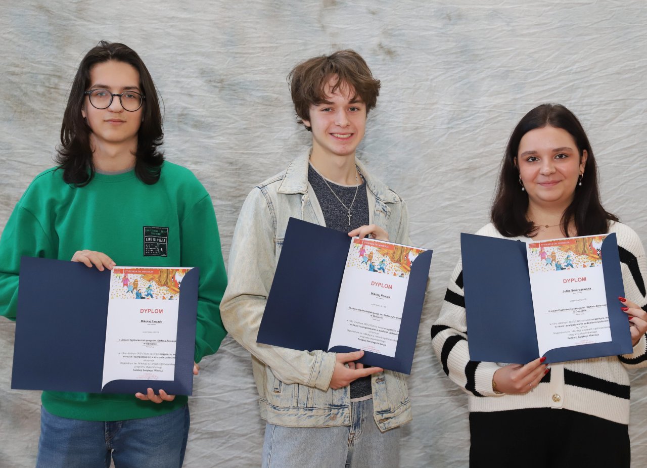 Na początku listopada odbyło się oficjalne wręczenie dyplomów poświadczających uzyskanie stypendium Fundacji Św. Mikołaja, z którą nasza szkoła współpracuje już od niespełna dziesięciu lat. Warto wspomnieć, iż stypendia takie przyznawane są na podstawie regulaminu przez szkolną komisję stypendialną, która decyduje kto spełnia określone warunki. Tym razem zaszczyt ten przypadł 3 uczniom klas IE oraz IIICDE, a mianowicie Julicie Smardzewskiej, Mikołajowi Pawlakowi oraz Mikołajowi Zawadzie czego szczerze im gratulujemy!